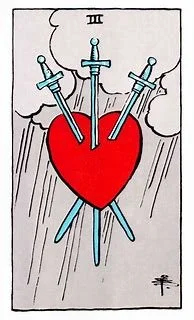 THE THREE OF SWORDS TAROT CARD represents heartbreak, emotional pain, and the necessary sorrow that leads to wisdom. It symbolizes the moment when mental clarity cuts through illusion to reveal painful truths about relationships, betrayal, or loss. This card embodies the principle that while truth can be devastating, it is also liberating, and that genuine healing can only begin with honest acknowledgment of what has been wounded. The card often signifies betrayal by those we trusted, whether through infidelity, broken promises, or the discovery that someone we loved was not who we believed them to be. It also represents the emotional pain and the need for forgiveness to release the shrapnel from the wound.